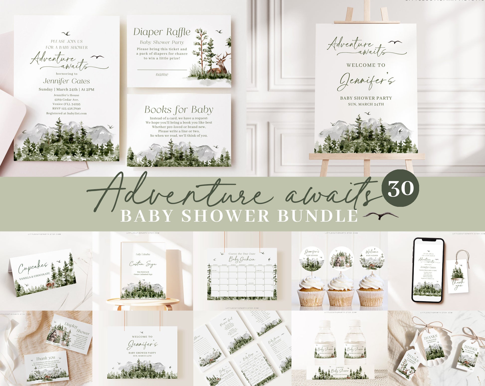 Editable Adventures await Baby Shower Invitations Bundle, Adventure Awaits Baby Shower Set with Games Bundle and All Decorations ADVBS001